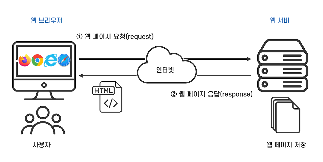 기존의 클라이언트-서버 구조에서는 클라이언트가 서버에 요청을 보내고, 서버가 이에 응답하는 구조를 가지고 있었다. 하지만, 웹 애플리케이션에서는 이러한 구조를 웹 브라우저가 클라이언트로서 사용되도록 확장한다.