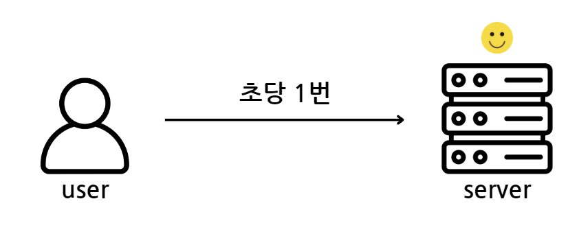 런칭한 지 얼마 안 된 서비스가 하나 있다고 가정해보겠습니다. 처음엔 서비스가 있는 줄도 모를테니 유저가 굉장히 적을겁니다. 그래서 이제 1초에 한 명정도 사용한다고 가정하면 서버는 아주 행복할 겁니다. 전혀 부담스럽지 않은 요청이거든요.
