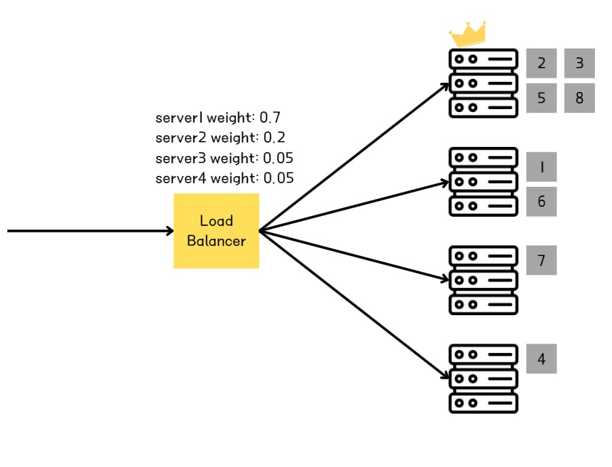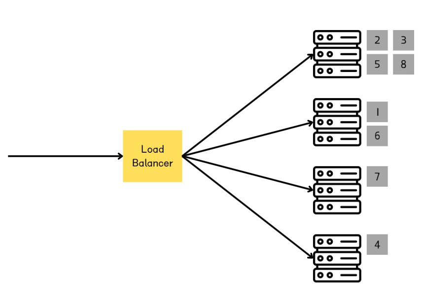 이름 그대로 로드 밸런서가 아무 서버를 선택해서 분배하는 방식입니다. 불균등하게 분배를 했어도 상관하지 않고 단순히 랜덤으로 선택하여 서버에게 분배하는 방식이므로 운 나쁜(?) 서버라면 다른 서버에 비해 많은 부하가 걸릴 수도 있습니다. 하지만, 큰 수의 법칙에 의해 결론적으로 라운드 로빈 방식과 크게 다르지 않을 정도로 균등하게 분배됩니다.