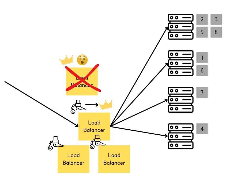 SPOF를 해결하기 위한 다양한 전략들이 있지만 그 중 하나로 여러 개의 slave 로드 밸런서들을 두고 master 로드 밸런서가 실패했을 때 slave 로드 밸런서들 중 하나가 master 로드 밸런서의 역할을 위임받아 대체하는 방식이 있습니다.