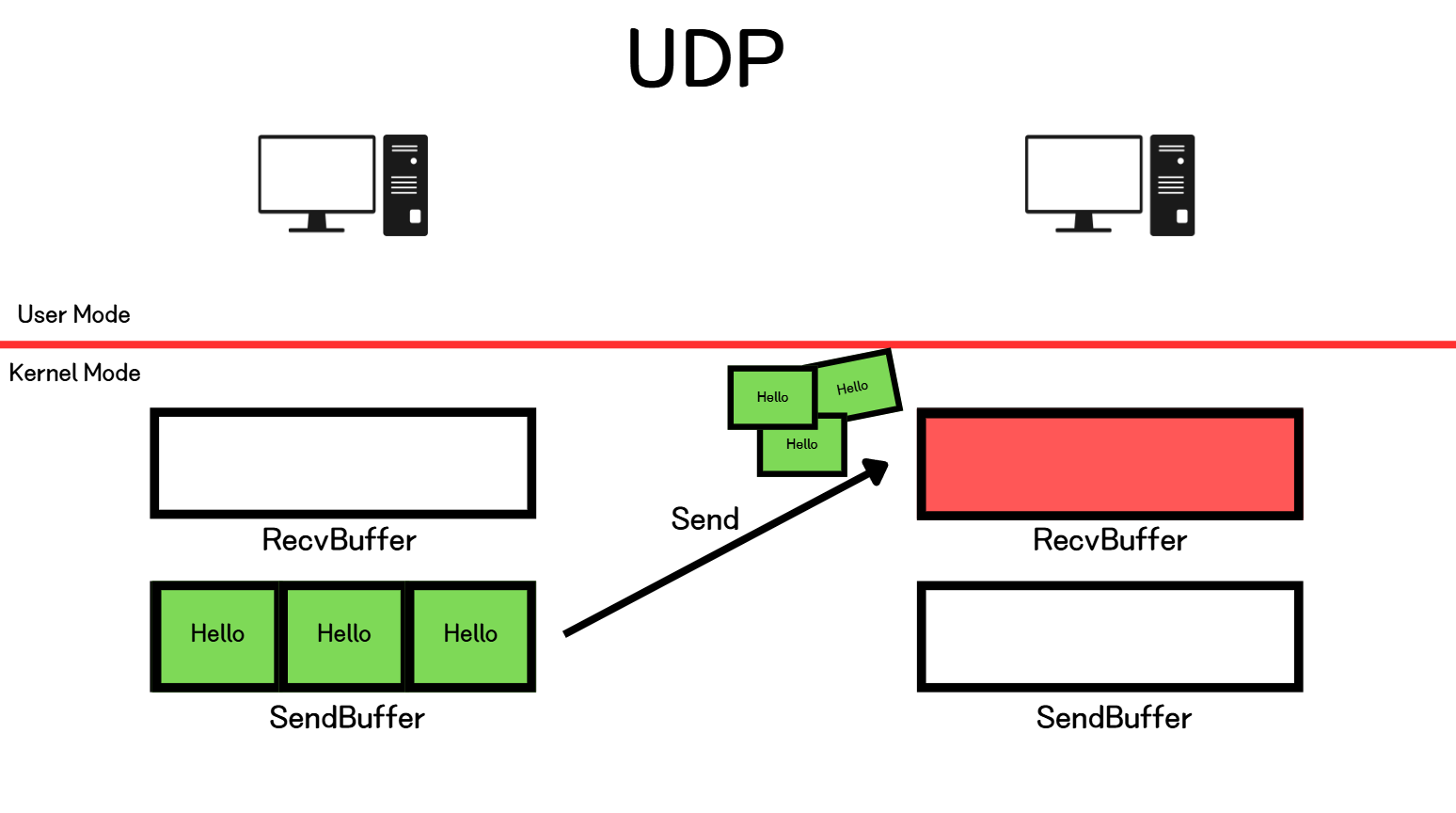 UDP는 상황을 고려하지 않고 데이터를 전송하기 때문에 버퍼가 꽉 차 있어도 계속 데이터를 전송하는 반면, TCP는 데이터를 받지 못하는 상황임을 인지하고 데이터 전송을 중단할 수 있습니다.(흐름 제어)