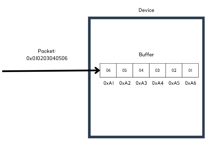 리틀 엔디안은 빅 엔디안과 반대로 작은 값이 먼저 저장되는 방식으로, 여기서 작은 값은 하위 바이트를 의미한다. 예를 들어 리틀 엔디안 방식을 사용하는 시스템에서 패킷을 수신받았다면, 시스템은 최하위 바이트 -> 최상위 바이트 순으로 메모리(buffer)에 저장하며, 결과적으로 데이터 시작 주소에 최하위 바이트 값이 저장되게 된다.