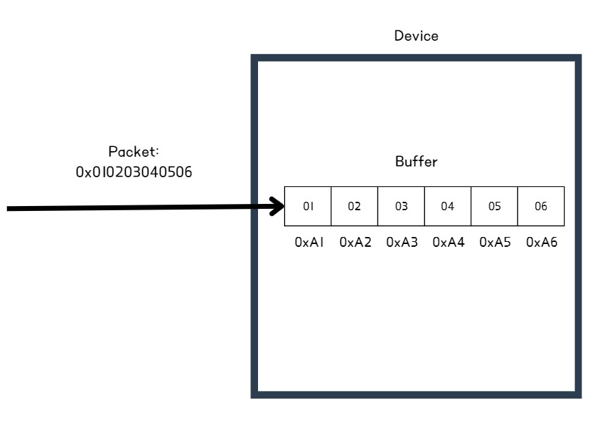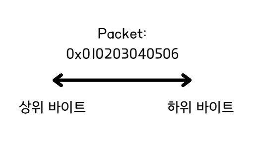 빅 엔디안은 큰 값이 먼저 저장되는 방식으로, 여기서 큰 값은 상위 바이트를 의미한다. 예를 들어 빅 엔디안 방식을 사용하는 시스템에서 패킷을 수신받았다면, 시스템은 최상위 바이트 -> 최하위 바이트 순으로 메모리(buffer)에 저장하며, 결과적으로 데이터 시작 주소에 최상위 바이트 값이 저장되게 된다.