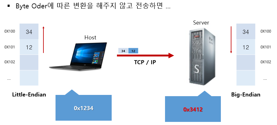 TCP 통신을 하는 과정에서 각 터미널이 서로 다른 엔디안 방식을 사용하면 문제가 발생한다. 위 그림과 같이 클라이언트-서버 구조에서 클라이언트가 리틀 엔디안 방식으로 "0x1234"를 보냈을 때, 서버는 " 0x1234"가 아닌 "0x3412"로 해석하기 때문이다.