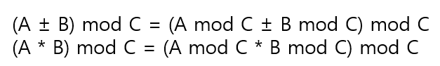 나머지 연산 즉, 모듈러 산술 연산은 아래와 같이 분배 법칙을 성질로 가지고 있기 때문에 매 반복마다 사용해도 결과값이 동일하다.