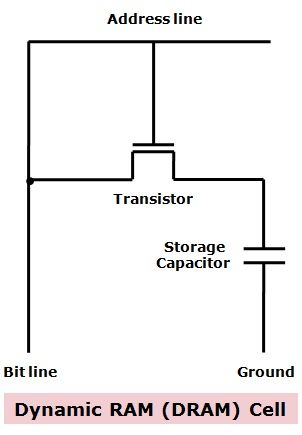 DRAM은 SRAM과 다르게 전하를 커패시터(capacitor)에 충전하여 0 또는 1을 표현하게 됩니다. 커패시터에 전하가 충전되어있으면 1, 그렇지 않으면 0을 의미하게 됩니다. 이렇게 커패시터를 사용하게 되면 사용해야하는 논리게이트의 수가 크게 줄어들게 되고 이는 비용 절감과 크기 감소라는 장점을 얻게됩니다.
