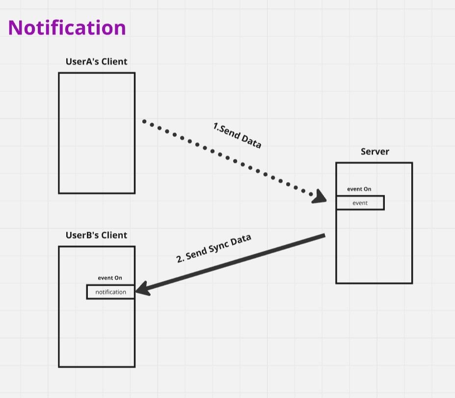 이번에 새로 생긴 통신 방식이다. 통지는 해당 클라이언트에게 요청도 없었을 때 전송하는 데이터다. 일반적으로 다른 클라이언트가 서버에게 요청했을 때, 해당 요청과 관련된 다른 클라이언트에게 변경된 동기화 데이터에 대한 통지를 하게된다.