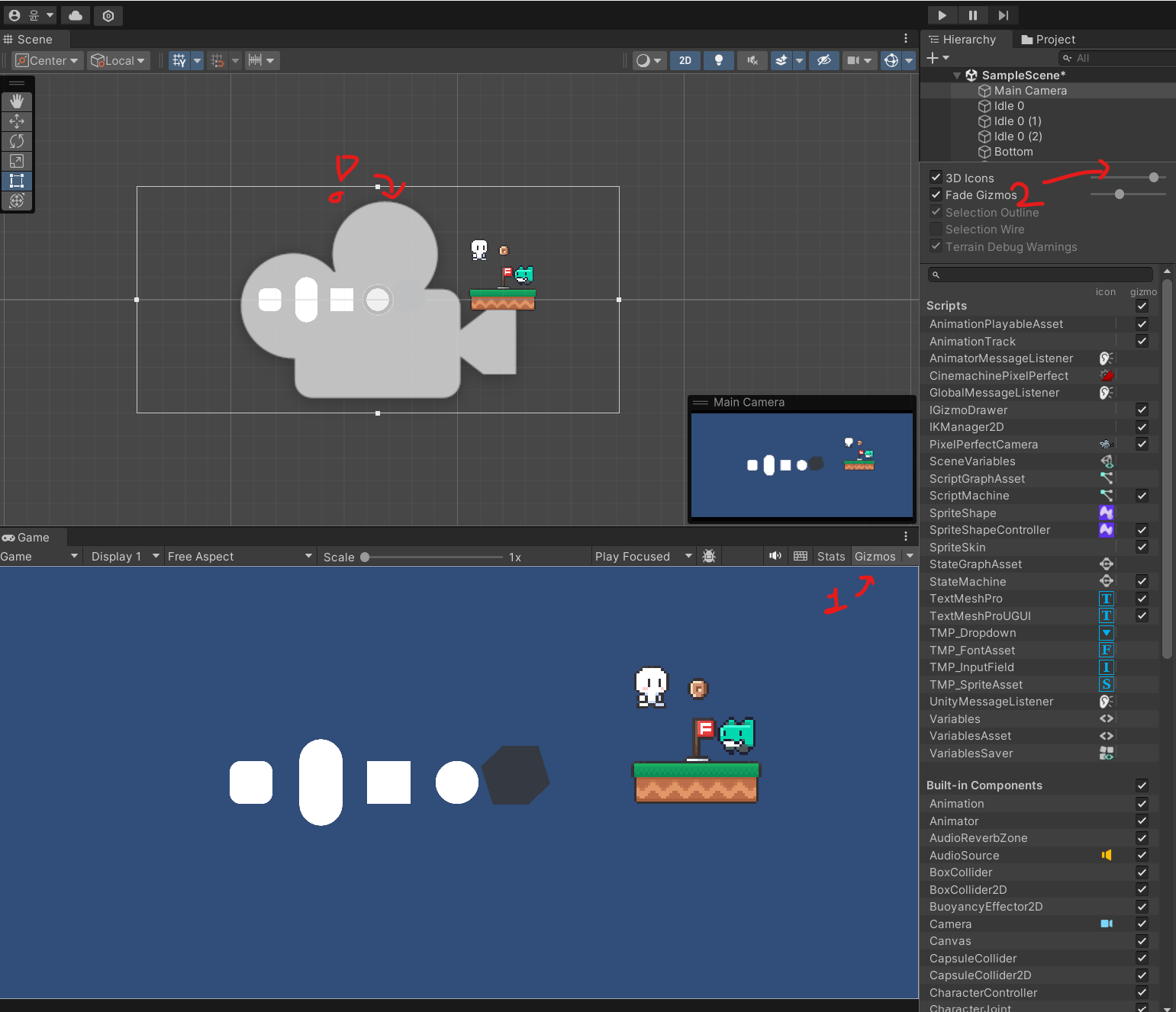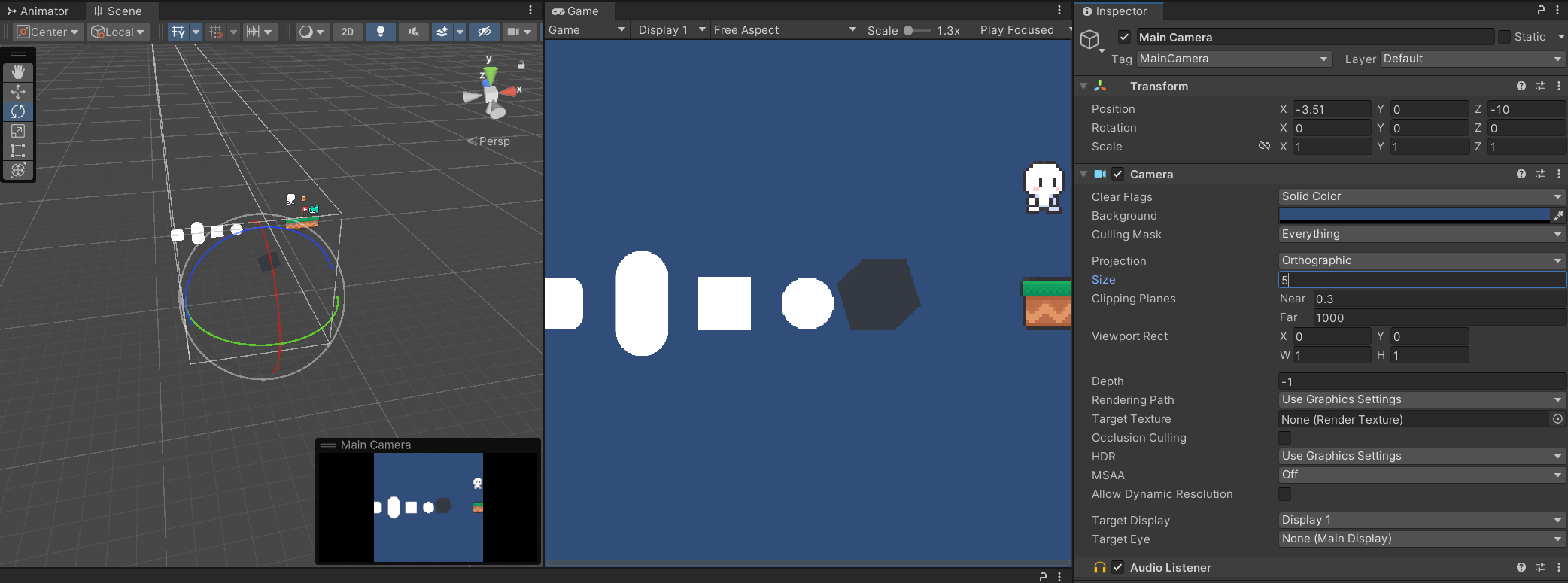 메인 카메라의 size를 바꾸면 Game화면이 확대/축소가 된다. 원리는 간단하다. 카메라가 담을 화면의 정사각형의 길이를 바꾸는 거다. 그래서 size를 바꾸면 Scene에서 카메라의 촬영 범위가 바뀌는 걸 볼 수 있다.