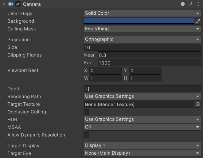 만약, 카메라의 담을 화면의 범위를 변경하고 싶다면 카메라 컴포넌트에서 Clipping Planes, Viewport Rect의 설정 값을 변경하면 된다.