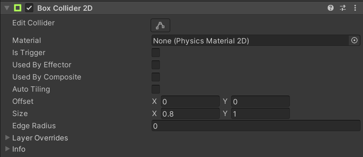 - Box collider 2D: 충돌 이벤트를 처리하는 박스형 영역