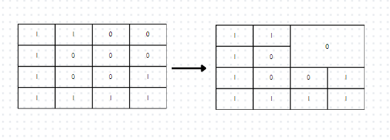 이 문제는 이미지를 압축할 때 사용하는 방식 중에 하나로 보인다. 압축 방식은 문제 설명에 적혀있는 것처럼 특정 영역에 있는 모든 비트가 동일하면 해당 비트 1개로 압축시킨다. 즉, 아래 사진처럼 압축한다(입력 예제 활용)