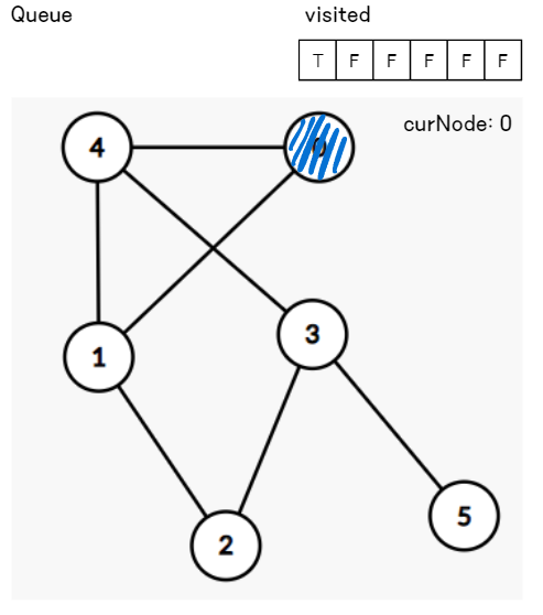 큐에서 노드를 하나 꺼낸다. 꺼낸 노드는 현재 탐색 중인 노드가 된다.