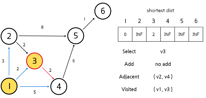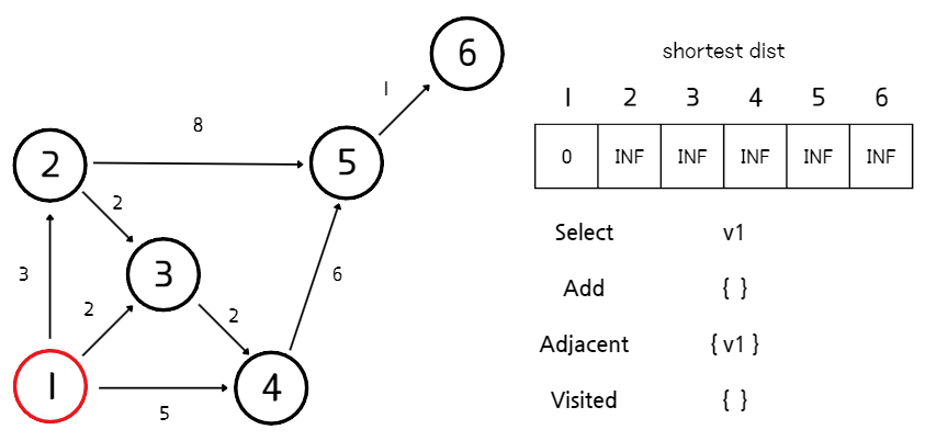 - 방문한 정점들을 거쳐 도달할 수 있는 정점들의 집합 (Adjacent)에서 시작점으로부터 가장 짧은 경로를 가진 정점을 선택한다. 처음에는 시작점이 선택된다.
