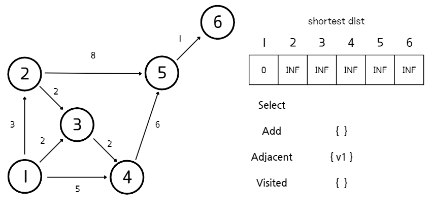 - Visited: 방문한 정점들의 집합. 방문한 정점들은 최단 거리가 확정된 정점을 의미한다.