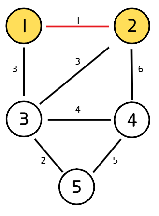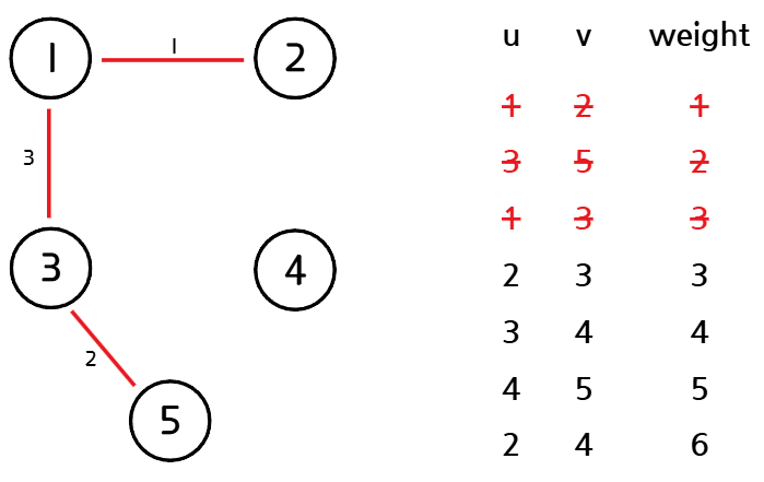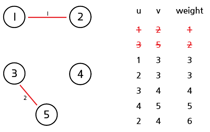 가중치가 가장 작은 간선을 선택한다. 선택한 간선이 정점 u, v를 연결하는 간선이라고 할 때, u, v가 같은 집합에 속해있다면(사이클을 만든다면) 해당 간선을 버리고 2번 과정을 반복한다.
