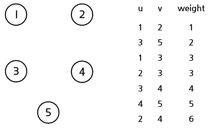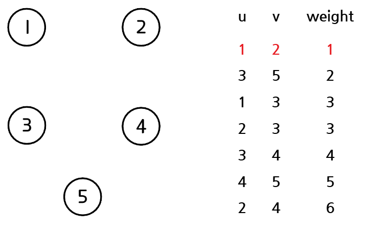 그래프에 존재하는 모든 간선들을 가중치가 작은 순으로 정렬한다. 그리고 각 정점에 대해 서로소 부분 집합을 구축한다.