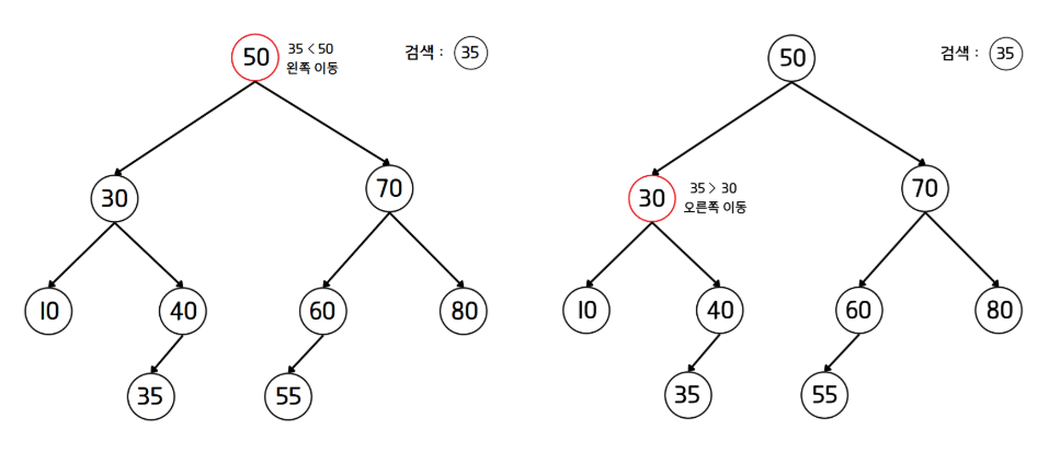- 값이 검색 값과 일치하다면 검색을 종료한다. 일치하지 않을 경우, 검색 값이 더 작으면 왼쪽 자식 노드로, 더 크다면 오른쪽 자식 노드로 이동한다.