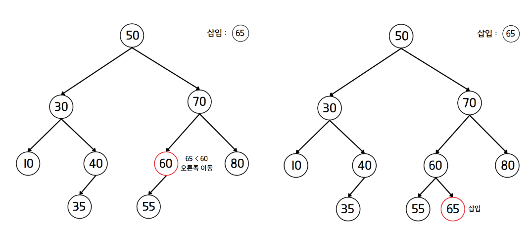 - 더 이상 이동할 수 있는 노드가 없다면 해당 위치에 노드를 삽입한다.