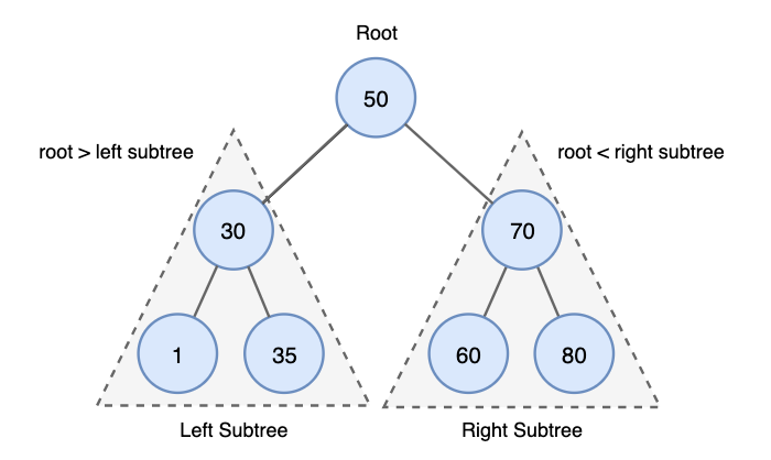 왼쪽 서브트리에 있는 모든 값은 부모 노드의 값보다 작으며, 오른쪽 서브트리에 있는 모든 값은 부모 노드의 값보다 크다.