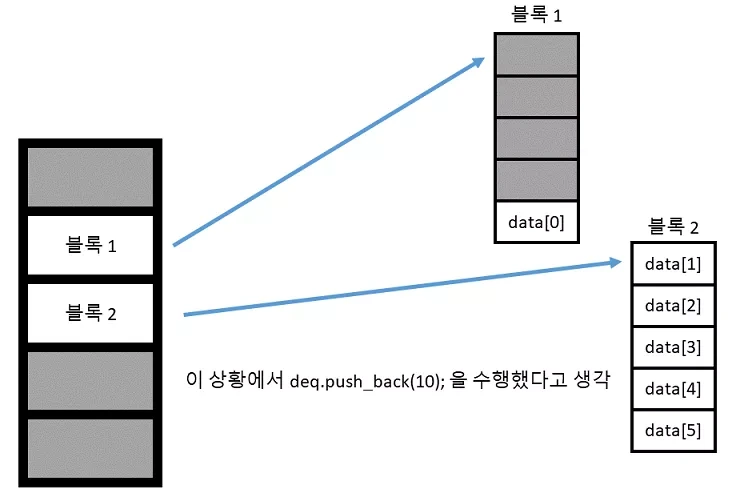 - 데크(deque)는 일정 크기의 작은 메모리 블록들을 가리키는 포인터 벡터와 같은 자료구조이다.