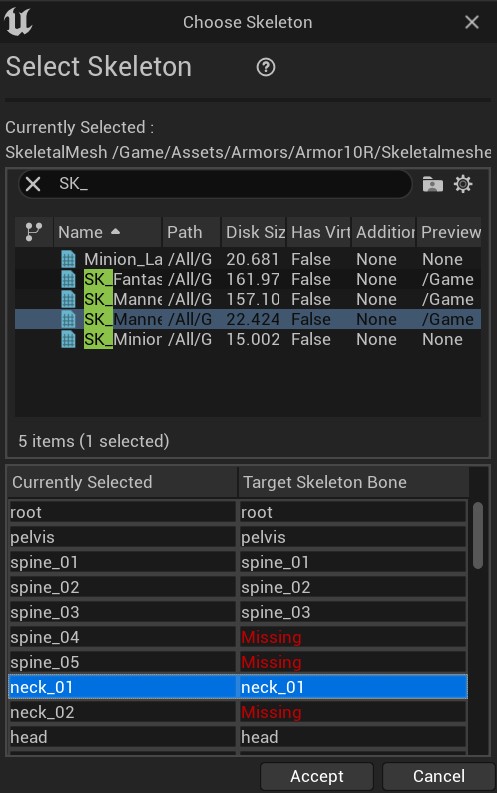 3. 사용하고자 하는 갑옷의 Skeleton이 내 캐릭터의 Skeleton과 일치해야 한다.