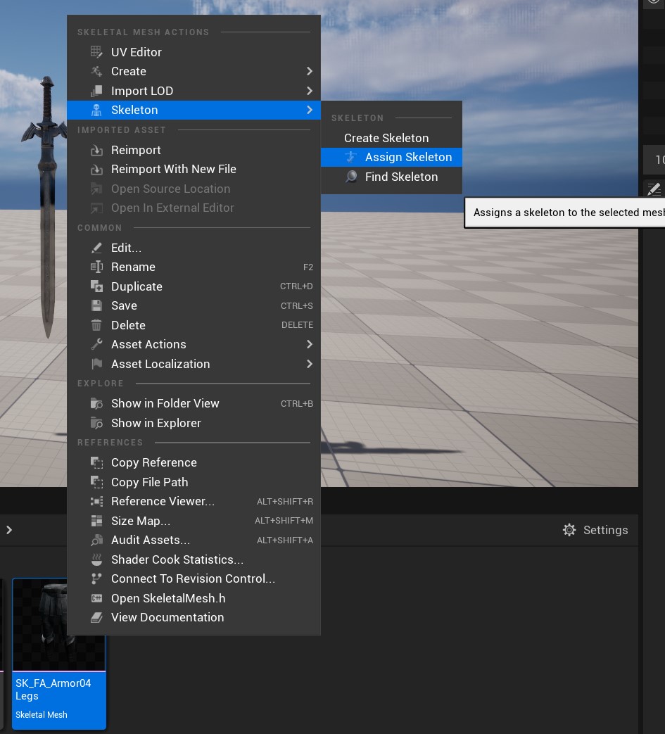 - 방법은 간단하다. 적용할 Skeletal Mesh를 찾고, 오른쪽 버튼 클릭 → 나오는 창에서 상단에 표시되는 Skeletal Mesh Actions 카테고리의 Skeleton → Assign Skeleton을 클릭한다.