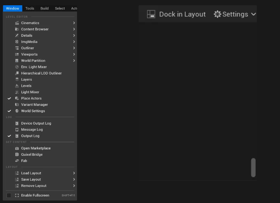 - 불편함을 없애기 위해 Output Log 창을 레이아웃에 고정시키는 방법은 두 가지 방법이 있는데 첫 번째 방법은 Output Log 창에서 오른쪽 상단에 있는 Dock in Layout을 클릭하는 거고,